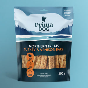 Herkulliset ja täysin viljattomat PrimaDog Northern Treats Kalkkuna-peuratangot saavat mukavan koostumuksensa ensiluokkaisista raaka-aineista, paahteisesta uunista ja ripauksesta pohjoisen superfoodia, mustaherukkaa. Tämä erittäin lihaisa koiranherkku on pohjoismaisen tuotekehityksen tulos. Northern Treats -koiran herkut tulevat tehtaaltamme Virosta.