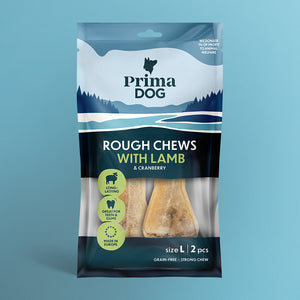 PrimaDog Rough Chews Lammas-Karpalo on maukas puruluu isoille ja keskikokoisille koiralle hampaiden ja suun hyvinvoinnin tueksi. Maistuva lammastäyte tekee puruluusta erityisen herkullisen, ja ripaus pohjoisen supermarja karpaloa antaa koirallesi luonnollisen C-vitamiinilisän.