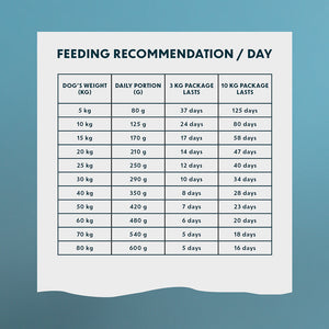 Koiran paino (kg) Päiväannos (g) 5 kg 80 g 10 kg 125 g 15 kg 170 g 20 kg 210 g 25 kg 250 g 30 kg 290 g 40 kg 350 g 50 kg 420 g 60 kg 480 g 70 kg 540 g 80 kg 600 g Ruokintaohjeet ja käyttöohjeet