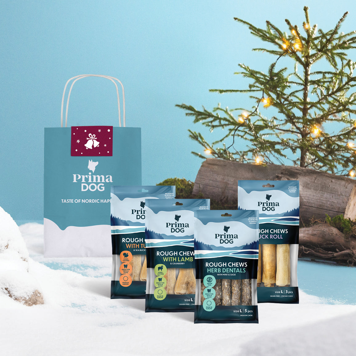 Purupaketti isolle koiralle tarjoaa vahvaleukaisille koirille runsaasti kestävää purtavaa ja maukasta tekemistä joulun pyhiksi. Paketti sisältää neljä L-koon PrimaDog Rough Chews -puruluuta sekä paperikassin ja lahjapakettitarran, joilla paketoit joululahjan käden käänteessä.